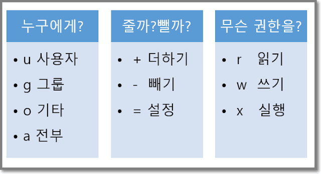 r : 읽기 / w : 쓰기 / x : 실행 / - : 권한 없음